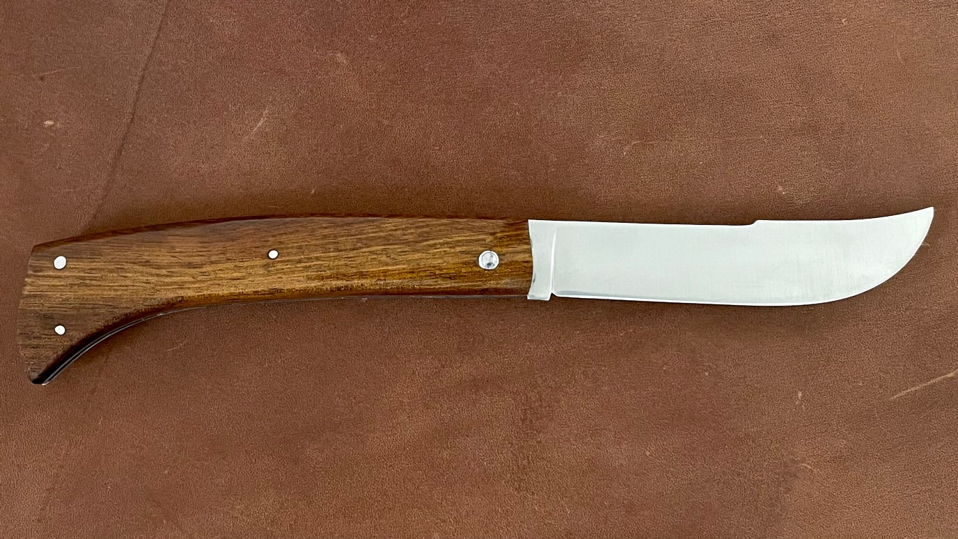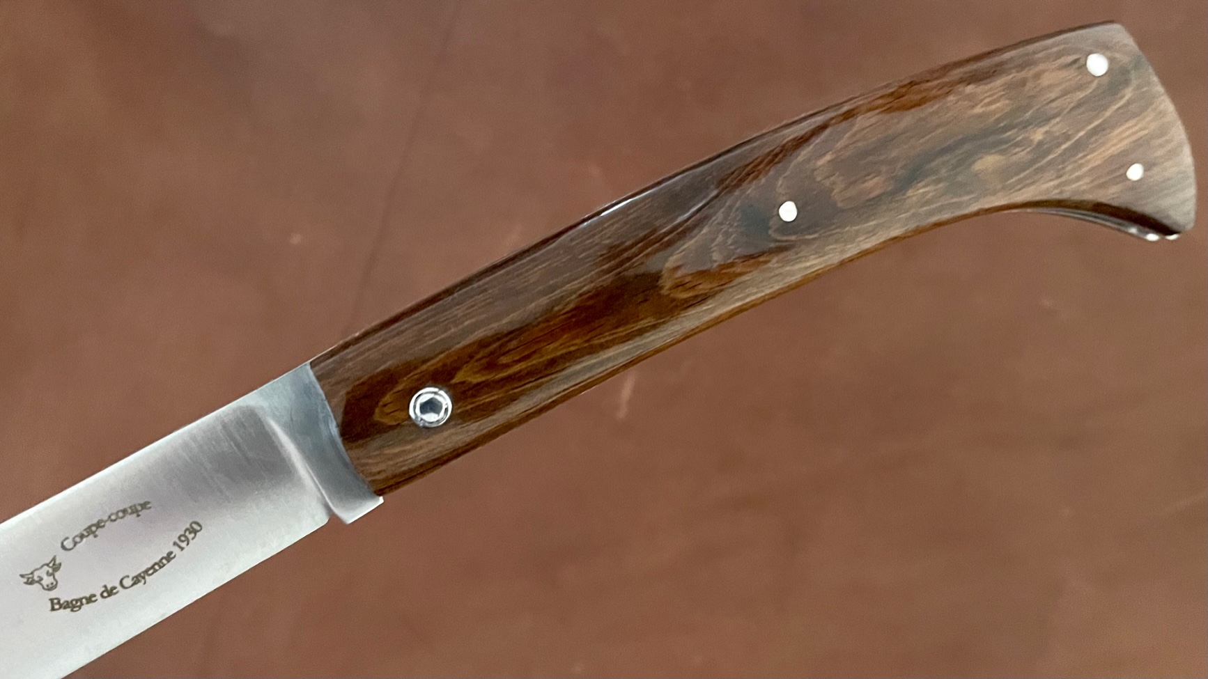 Info :Modèle rendant hommage au célèbre "Coupe-Coupe" (sabre assez court, à large lame, utilisé pour se frayer un chemin dans la brousse ou dans la forêt vierge dans les pays tropicaux), ce modèle est proposé avec du bois de 1930 provenant du Bagne de Cayenne.